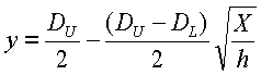 в котором DU – диаметр верхнего отверстия 48, и DL – диаметр нижнего отверстия 46, и h – длина проточного канала 44. Однако, как упомянуто, могут быть использованы другие полученные путем вычислений математические выражения для получения нелинейного профиля потока, который является оптимальным для других параметров клапана, включая подобные выражения любого порядка, меньшего или большего единицы.
