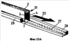 На опорном устройстве 29, которое может перемещаться от одной канавки 26 с параллельными стенками к другой канавке 26 с параллельными стенками в направлении стрелок 30, предусмотрена клинообразная канавка 27, также образованная планками 28 примерно такого же типа, что и планки 24. Указанная клинообразная канавка 27, клинообразная форма которой сужается в продольном направлении в сторону канавок 26 с параллельными стенками, служит для приема заготовки 31 строительного элемента, образованной полкой 2 и двумя еще не деформированными стенками 3, 4, проходящими параллельно друг другу вдоль полки 2 и прикрепленными к ней, и для размещения указанной заготовки в канавку 26 с параллельными стенками при перемещении заготовки строительного элемента в направлении стрелки 32 на фиг.12, и при этом концевые зоны 7 стенок 3, 4 сдавливаются друг с другом. Для этой цели концевые зоны 7 стенок 3, 4, которые должны соединяться друг с другом, предварительно покрываются клеящим веществом. Для того чтобы предотвратить выскакивание заготовки 31 строительного элемента из канавки 26 с параллельными стенками, вызываемое силами сжатия, возникающими при деформации стенок 3, 4, высота туннеля 21 выбрана такой, что полка 2, как показано на фиг.12, прилегает к внутренней поверхности 33 туннеля 21, противоположной канавкам 26 с параллельными стенками. На фиг.13A-D показано, как происходит деформация стенок 3, 4 при продольном перемещении вдоль клинообразных канавок 27.