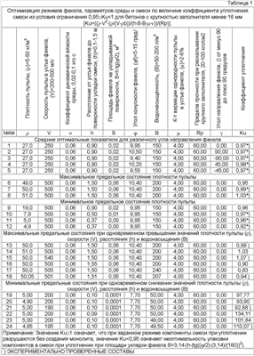 при следующих соотношениях интегральных показателей параметров смеси, функциональных режимов факела и характеристик среды пространства: плотность пульпы ( ) 5-50 кг/м3; скорость пульпы в устье факела (V) 200-500 м/с; коэффициент объемной загрузки транспортной системы Kz= /(V· b); плотность обычного тяжелого бетона ( b) 2000-2500 кг/м3; расстояние от устья факела до поверхности укладки смеси (h) 0,1-1,5 м; площадь факела на укладываемой поверхности S=h·tg( f/2), м2; угол конусности факела ( f) 6-15°; водонасыщенность смеси (В) 50-250 л/м3; динамический коэффициент рабочей среды пространства ( P) 0,02-0,1 кгс·с; коэффициент вариации однородности пульпы в устье факела (µ) 0,02-0,12; предел прочности при раскалывании заполнителя (RP) 1-100 кгс/м2; угол направления инерционного перемещения факела относительно горизонта ( ) от минус 90 до плюс 90°;