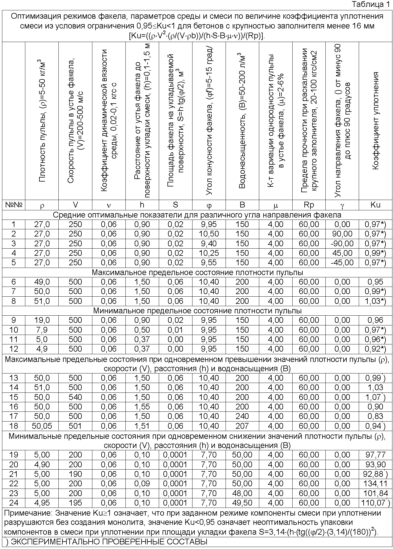Для минимизации коэффициента уплотнения и сокращения сроков твердения бетонных структур на цементом вяжущем один из возможных вариантов оптимизации значения коэффициента уплотнения бетонной смеси при бетонировании под сверхвысоким давлением от единого напорного энергоисточника, является то, что осуществляют регулирование и оптимизацию коэффициента уплотнения бетонной смеси при бетонировании с использованием скоростной силовой инерционной характеристик компонентов смеси, с учетом положения и формы факела по комплексным показателям параметров смеси, и/или функциональных режимов факела, и/или характеристики среды пространства по зависимости: