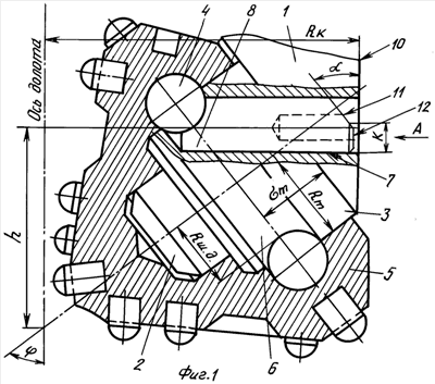 – угол наклона оси цапфы к оси долота; Rш.д. – минимальный радиус шариковой дорожки, мм; Rm – радиус подшипника скольжения у основания цапфы, мм; Rк – расстояние от оси долота до спинки лапы;