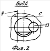 На замковом пальце 8 со стороны спинки 10 лапы 1 выполнена площадка 11, расположенная под углом =(90- )±1°, при этом точка пересечения наклонной площадки 11 со спинкой 10 лапы 1 смещена относительно нижней образующей замкового пальца 8 в сторону, противоположную забою. Величина указанного смещения К наклонной площадки 11 составляет 0.4-0.6 диаметра замкового пальца 8. Площадка 11 создается для сверловки центрового отверстия, которое используется при обработке цапфы 2, а также для фиксации замкового пальца 8 от осевого перемещения при износе спинки 10 лапы 1, что часто приводит в существующих долотах к заклиниванию шарового подшипника 4. Круговая часть 12 торца замкового пальца 8 используется для крепления его к спинке 10 лапы 1 сваркой. Сверление канала 7 производят с учетом смещения его оси от оси симметрии 9 лапы 1 на величину С, зависящей от размера долота (см. фиг.2). Палец 8 смещают относительно оси 9 лапы 1 в сторону, противоположную направлению вращения долота, что предотвращает его от износа абразивным шламом. От проворота замковый палец 8 фиксируется штифтом 13, который с той же целью располагают относительно пальца со стороны сбегающей грани лапы 1.