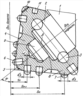 – угол наклона оси цапфы к оси долота; n – порядковый ряд венца зубков, начиная от оси долота; d3 – диаметр твердосплавных зубков, расположенных на основном конусе шарошки, мм; d’3 – диаметр твердосплавных зубков, расположенных на первом ряду основного конуса шарошки, мм.