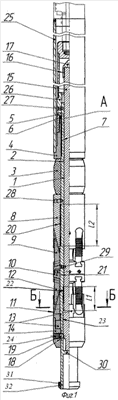 Делают натяжку инструмента (например, на 1 тонну = 10 кН), при этом срезные элементы 29 разрушаются, и съемный узел 15 приподнимается на величину «L1» (фиг.1) относительно ствола 1, и выступ 23 съемного узла 15 взаимодействует с торцом ступени внутренней цилиндрической выборки 22 ствола 1, при этом шарики 19 выпадают во внутрь ствола 1 на заглушку 30, выполненную в виде глухой поперечной перегородки, и обеспечивается дальнейшее перемещение ствола 1 относительно элементов 8-12, при этом дополнительный конус 11, выполненный в виде трех плашек 11′; 11”; 11”’ опускается вниз относительно ствола 1, освобождая дополнительные шлипсы 12, которые отходят от внутренней стенки эксплуатационной колонны и сдвигаются к центру.