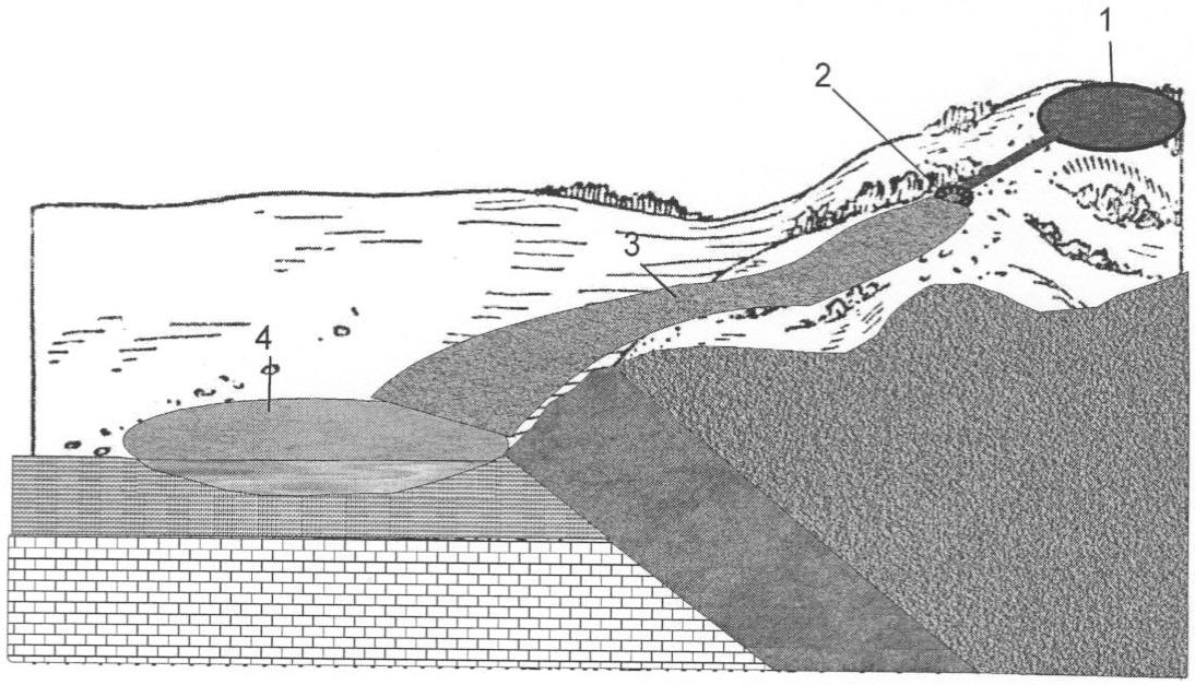 На фиг.1 представлена схема селевой геотехнологической подготовки месторождения. Где: 1 – накопленный запас воды, 2 – подготовленный участок недр, 3 – руслоотводная канава, 4 – зона реструктуризации.