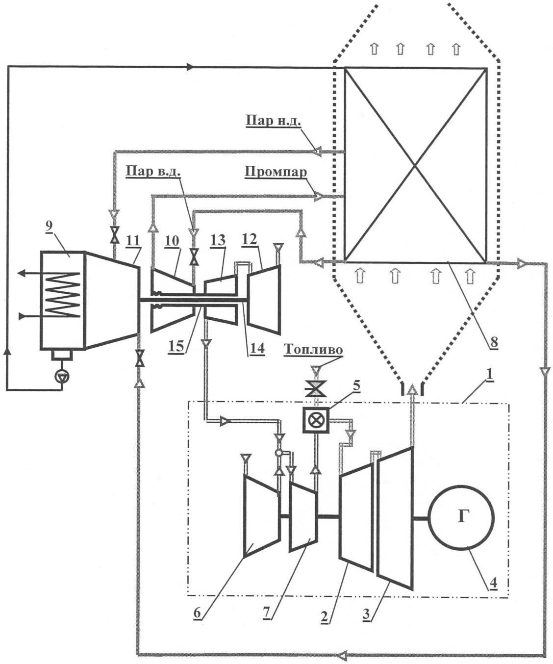 Атмосферный воздух сжимают в компрессорах 6, 7, а также в каскадах дополнительного компрессора 12 и 13 и подают в камеру сгорания 5, куда подают также топливо. Продукты сгорания топлива (газы) из камеры сгорания 5 поступают в газовые турбины 2 и 3, где, расширяясь, совершают работу по приводу компрессоров 6, 7 и турбогенератора 4. В КУ 8 теплом выхлопных газов газовой турбины 3 вырабатывают пар. В данном примере в КУ 8 вырабатывают пар двух давлений, а также осуществляют промежуточный перегрев пара за первым цилиндром 10 паровой турбины. Пар из КУ 8 подают в цилиндры 10 и 11 паровой турбины, совершающей работу по приводу каскадов 12 и 13 дополнительного компрессора. Отработанный в паровой турбине пар расширяется до давления в конденсаторе 9, где конденсируется, а полученный конденсат возвращается в КУ 8.