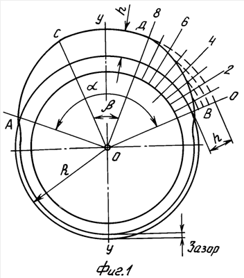 Профиль кулачков выполнен следующим образом: через центр О начальной окружности радиуса R проводится линия У-У, соответствующая плоскости симметрии кулачка. Из центра начальной окружности О радиусом, равным сумме радиуса R начальной окружности кулачка и высоты h подъема клапана, проводится дуга, на которой от линии У-У откладываются симметричные отрезки дуги, равные половине угла перекрытия клапанов, с образованием сектора СОД с дугой постоянного радиуса СД. В пределах угла сектора СОД клапан находится в полностью открытом положении. От линии У-У в обе стороны откладываются углы УОА и УОВ, равные половине утла поворота кулачка от начала открытия клапана до его закрытия, с получением сектора АОB, соответствующего работе кулачка от начала открытия клапана до его закрытия. Сектор ДОВ линиями, проведенными из центра О начальной окружности, делится на произвольное количество равных элементарных углов. На продолжении радиуса ОB откладывается отрезок h, который делится на равные отрезки, соответствующие количеству равных элементарных углов в секторе ДОВ, при этом радиусами из центра О начальной окружности до полученных точек на отрезке h проводятся дуги до пересечения с соответствующей радиальной линией, ограничивающей очередной элементарный угол в секторе ДОВ. Точки пересечения проведенных дуг с указанными радиальными линиями соединяются проходящей через них кривой, с получением боковой дуги профиля кулачка ДВ. Дугой, симметричной дуге ДВ относительно линии У-У, соединяются точки А и С.