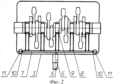 При подготовке двигателя к пуску сначала осуществляют прогрев масла в поддоне 3. Для этого включают в работу подогреватель 1, от которого по трубопроводу 2 горячие газы направляются к масляному поддону 3 двигателя, осуществляя с помощью теплопередачи прогрев масла в поддоне. После нагрева масла до заданной температуры включают автономный привод 6, приводящий в действие масляный насос 5. При работе масляного насоса 5 нагретое масло забирается через заборник во всасывающую полость. Из нагнетательной полости масляного насоса нагретое масло подается в магистраль 7, расположенную вдоль двигателя. Установленные на магистрали 7 сопла 8 обеспечивают подачу нагретого масла на прогреваемые участки двигателя – подшипники 9 коленчатого вала. Масло, попав в зону подшипников 9 коленчатого вала, отдает тепло и стекает в поддон 3 для подогрева. После прогрева двигателя до состояния, обеспечивающего его надежный пуск, предпусковой подогреватель 1 и масляный насос 5 выключают и производят запуск двигателя. После запуска на работающем горячем двигателе масло из магистрали 7 стекает в поддон 3 через дренажные отверстия 10 и таким образом магистраль 7 опорожняется от находящегося в ней масла. В результате исключается возможность образования в магистрали 7 после охлаждения двигателя пробок из застывшего масла, что позволяет при подготовке двигателя к очередному пуску обеспечить быструю подачу теплого масла по всей длине магистрали 7 одновременно ко всем подшипникам 9 коленчатого вала. В результате чего время подготовки двигателя к запуску сокращается.