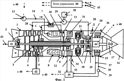 Перед рабочим цилиндром 19 (рабочими цилиндрами 19) установлен теплообменник 31, который трубопроводами рециркуляции 32 и 33, в одном из которых установлен насос рециркуляции 34, соединен с ядерным реактором 35. Внутри форсажной камеры 15 установлен форсажный теплообменник 36, который трубопроводами рециркуляции 37 и 38, в одном из которых установлен насос рециркуляции 39, соединен с ядерным реактором 35. Авиационный двигатель оборудован блоком управления 40 и датчиками частоты вращения внутреннего и внешнего валов, соответственно, 41 и 42. С блоком управления 40 электрическими связями 43 соединены датчики частоты вращения 41 и 42 и насос 13 и привод 30. Внутри обтакателя 16 установлен привод обтекателя 44, соединенный электрическими связями 43 с блоком управления 40.