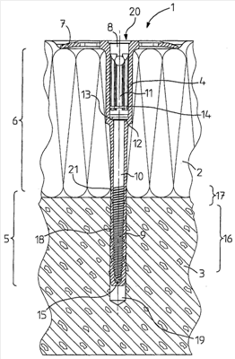 Для осуществления крепления с помощью распорного дюбеля 1 первоначально через плиту 2 изоляционного материала вплоть до основания 3 с врезанием внутрь выполняется сверленое отверстие 19. В дальнейшем распорный дюбель 1 вставляется в гнездо 19 до тех пор, пока фиксирующий диск 7 не ляжет на плиту изоляционного материала 2. Затем распорный винт 8, который может быть вставлен уже при предварительном монтаже во втулку 4 дюбеля, вгоняется, вращаясь, в область 5 распирания распорного дюбеля 1. Винт для этого имеет в области головки 11 приспособление 20 для установки инструмента. Распорный винт 8 вгоняется до тех пор, пока заплечик 12 винта не будет посажен на заплечик 13 дюбеля. Втулка 4 дюбеля при дальнейшем вворачивании укорачивается по оси в области, предусмотренной для этого зоны 21 обжатия, вследствие чего фиксирующий диск 7 погружается в плиту 2 изоляционного материала. Если из-за этой деформации сжатия на распорном винте 8 создается дальнейший повышенный крутящий момент, то головка 11 распорного винта 8 срезается в области заданного места 14 разрушения. Таким образом, гарантируется, что винт ломается не в области резьбы 9 или хвостового участка 10, что ликвидировало бы его фиксирующее воздействие.