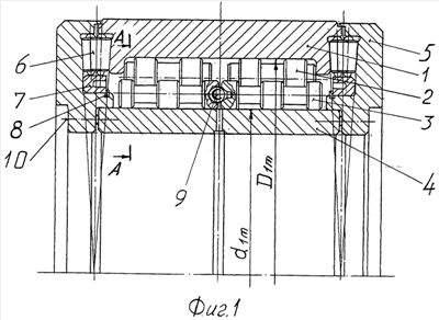 , где D1m – диаметр дорожки качения наружного кольца; Dwm2 – большая ступень ролика верхнего яруса; d1m – диаметр дорожки качения внутреннего кольца; Dwm1 – большая ступень ролика нижнего яруса, в проточки меньших ступеней роликов верхнего яруса входят три участка больших ступеней роликов нижнего яруса, при этом диаметры трех участков больших ступеней роликов нижнего яруса, контактирующих с тремя участками меньших ступеней роликов верхнего яруса, равны, и все ролики как верхнего, так и нижнего ярусов контактируют друг с другом и дорожками качения по трем линиям, образуя силовой единый замкнутый кольцевой комплект из роликов верхнего и нижнего ярусов, отличающийся тем, что в конических роликах выполнено ступенчатое коаксиальное отверстие, в котором свободно расположены виброэлементы, выполненные из металлокерамического сплава, например, из ВК25, сферического типа и различной массой, которые при этом расположены между двумя магазинами, выполненными из пористой металлокерамики, пропитанными смазкой и установленными на конусных участках отверстия, а конический ролик снизу содержит дополнительный подпятник, выполненный, например, из шарика, заключенного в обойму и опирающегося на тарельчатую пружину, последний контактирует с поверхностью опорного кольца, жестко зафиксированного в проточке свободного кольца подшипника.