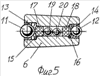 Подшипник качения комбинированный бессепараторный состоит: из наружного кольца 1, двух рядов роликов 2 верхнего яруса, роликов 3 – нижнего яруса, выполненных двухступенчатого типа, внутреннего кольца 4 – безбортового, двух свободных колец 5, двух рядов конических роликов 6, двух опорных колец 7, двух пружинных упорных колец 8, крепежных винтов 10. На конических роликах 6 (см. фиг.5) выполнено ступенчатое коаксиальное отверстие, в котором расположены с внешней стороны два подпятника 11 и 12, выполненные, например, из шариков, установленных в обоймах 13 и 14 с возможностью вращения. Подпятники 11 и 12 опираются на тарельчатые пружины 15 и 16, выполненные из антифрикционного материала. На конических участках отверстия ролика 6 установлены два магазина 17 и 18, выполненные из пористой металлокерамики, пропитанные смазкой. А в центральной части отверстия располагают виброэлементы 19 и 20, выполненные из металлокерамического сплава типа ВК25, ТК или ТТК по форме, например, шарика, цилиндра, последние установлены с зазором, различны по массе, в количестве 1; 2; 3; в зависимости от габаритов ролика 6. Два ряда роликов 3 нижнего яруса могут содержать фиксатор 9 для выборки зазоров в роликах 2 верхнего яруса.