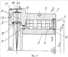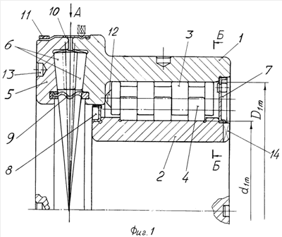 Комбинированный подшипник качения состоит из наружного кольца 1, внутреннего кольца 2, тел качения – роликов 3 и 4, тугого кольца 5, конических роликов 6, защитных шайб 7 и 8, защитной шайбы 9 упорного подшипника сильфонного типа, замковой шайбы 10, кольца 11, подпятника 12, трех цековок 13 на тугом кольце и трех цековок 13 на наружном кольце. На внутреннем кольце 2 выполнены, например, три паза 14. На конических роликах 6 выполнены подпятники по оси роликов – сферического типа, последние контактируют с высоким бортом колец 1 и 5. Подпятники 12 сферического типа расположены по оси роликов 3 верхнего яруса и контактируют с бортом кольца 1. Нижняя защитная шайба 9 жестко установлена в кольцевой проточке кольца 1, а в контакте с тугим кольцом 5 проходит со скольжением в проточке, при этом контактное кольцо шайбы 9 выполнено, например, из полиамида или углепластика. Защитная шайба 7 содержит, например, пресс-масленку для подачи смазки в полость радиального участка подшипника.
