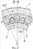 При этом комплект роликов 3 и 4 перемещается по кольцу влево (куда был должен перемещаться сепаратор). Кольцо 1 неподвижно. Тугое кольцо 5 получает вращение вправо (см. фиг.3), конические ролики 6, контактирующие с дорожкой качения кольца 5, получают вращение влево, а соседние ролики получают вращение вправо, обкатываясь без скольжения по дорожке качения кольца 1. При этом подпятники роликов 6 обкатываются по точке по поверхностям высоких бортов колец 1 и 5, последние воспринимают радиальную нагрузку по оси ролика. А весь единый замкнутый кольцевой комплект из роликов 6 перемещается по кольцу влево с частотой вращения, в два раза меньшей, чем частота вращения кольца 5.