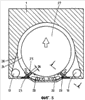 Фиг.2 показывает в качестве примера положение двух приемных камер 15 и 16 для смазочного материала выше горизонтальной средней плоскости. В зависимости от направления вращения валка капли 17 смазочного материала сильно разбрызгиваются на наружные поверхности 18 или 19 приемных каналов 5 для смазочного материала.