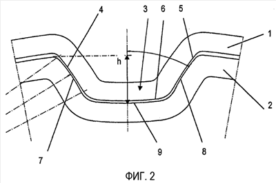 Того же эффекта можно, конечно, также достигнуть, если изгибы боковых поверхностей 4, 5 или соответственно 7, 8 расположены противоположно тому, как это представлено на фиг.3.