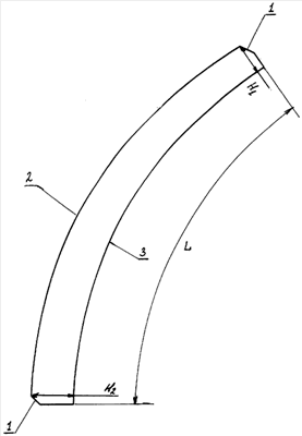 Фрикционная накладка выполнена из полимерного фрикционного композита и представляет собой часть цилиндрической обечайки переменной толщины, снабженной двумя или тремя рядами отверстий для заклепок. Накладка имеет переменную толщину Н в рабочей зоне (зоне, соответствующей поверхности фрикционного контакта при эксплуатации). Для накладки, имеющей боковые скосы 1 (показаны на чертеже), толщина Н определяется применительно к рабочей поверхности 2 накладки как минимальная H1 и максимальная Н2. Если накладка не имеет боковых скосов (на чертеже не показана), то H1 и Н2 определяются для краев накладки. Разность H2 и H1 определяет градиент толщины накладки в зоне рабочей поверхности. Длина L накладки по дуге внутренней (не рабочей) поверхности 3 соотносится с градиентом толщины накладки как 35÷36, то есть , где Н2 – толщина толстого края накладки; H1 – толщина тонкого края накладки; L – длина дуги накладки по внутренней поверхности.