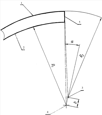 Конкретным примером заявляемого изделия является барабанная тормозная накладка грузового автомобиля, у которой радиус R1 внутренней поверхности 200 мм; радиус R2 внешней (рабочей) поверхности 206,5 мм; расстояние b между осями вращения поверхностей накладок 12 мм. При этом линия, соединяющая оси вращения цилиндрических поверхностей накладки, и при этом ортогональная каждой из них, образует угол  0°53′ с радиальной линией (радиусом) внутренней цилиндрической поверхности по линии ее контакта с плоской боковой поверхностью толстого конца накладки. При этом радиус внутренней цилиндрической поверхности накладки по линии ее контакта с плоской боковой поверхностью толстого конца находится в плоскости боковой поверхности толстого конца накладки.