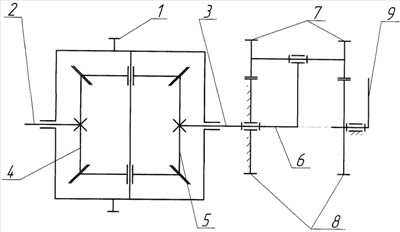 Вращение от двигателя подается на входное звено (водило) 1 дифференциала. Полученное водилом движение делится между выходными валами 2 и 3 с центральными колесами 4 и 5 соответственно. При неподвижном выходном валу 2 движение центрального колеса 5 передается на водило планетарного механизма 6, которое вместе с сателлитным блоком 7 свободно вращается вокруг центральных колес 8, которые остаются неподвижными, поскольку одно из них закреплено неподвижно, а передаточное отношение равно бесконечности при равных числах зубьев колес 8.