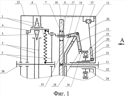 Устройство состоит из центральных фрикционных дисков 1 и 2, соответственно, внешних и внутренних, входящих в контакт с промежуточными коническими фрикционными дисками-сателлитами 3, зафиксированными с возможностью вращения на поворотных рычагах 4, посаженных с возможностью поворота на водиле 5. Поворотные рычаги 4 подпружинены относительно водила 5 с помощью пружин 6 так, чтобы сателлиты 3 под действием пружин стремились к центру вариатора, что соответствует уменьшению его передаточного отношения. Поворотные рычаги 4 на своих концах, противоположных тем, где посажены сателлиты 3, содержат толкатели-ролики 7, закрепленные с возможностью вращения на осях 8 и контактирующие с рабочими поверхностями профильных отверстий 9 (см. фиг.3) регуляторного звена, выполненного в виде диска 10, связанного с выходным валом 11 вариатора. Механические связи 12 (выделены на фиг.1 и 2 штриховой линией) выполнены в виде изогнутых рычагов 13, по количеству равных числу поворотных рычагов 4, шарнирно закрепленных на диске 14, установленном с возможностью поворота вокруг оси вращения вала 11, причем сами рычаги 13 выполнены с прорезями-кулисами 15 и 16 на обоих концах. В кулису 15 входит палец 17 на оси 8, а в кулису 16 – палец 18 на вращающейся обойме 19, сидящей на подшипнике 20 на втулке 21, посаженной с возможностью скольжения, но без возможности вращения на направляющей, например, на цилиндрической трубе 22 на корпусе 23 вариатора. На втулке 21 закреплена кольцевая направляющая 24, в которую входит вилка 25 на рычаге 26, закрепленном с возможностью поворота на корпусе 23 на валу 27, на одном из концов которого закреплен рычаг 28 (фиг.3 и 4). Рычаг 28 подпружинен пружиной растяжения 29 в сторону кронштейна 30, прикрепленного к корпусу 23. На свободном конце рычага 28 в отверстии закреплен болт 31 с головкой 32 и гайкой 33 на резьбовом конце 34 болта 31. Болт 31 входит в дуговую прорезь 35 (фиг.4) в кронштейне 36, закрепленном на корпусе 23. Кронштейн 36 содержит шкалу 37 для определения передаточного отношения вариатора или частоты вращения выходного вала 11. Входной вал 38 (фиг.1 и 2) соединен с дисками 2 возможностью передачи крутящего момента.