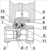 Подвижный шток 6, взаимодействует с меньшим плечом рычага усилителя хода 11, установленного на оси 12, расположенной в нежидкостной полости 13. На большем плече рычага усилителя хода 11 с зазором относительно седла 8 закреплен клапан 7, что обеспечивает его большее перемещение, чем перемещение подвижного штока 6.