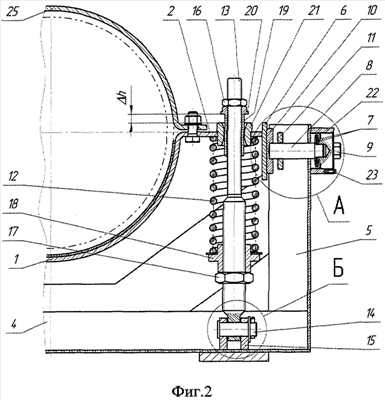 Предлагаемая сейсмозащитная опора для трубопровода включает ложемент 1 с двумя площадками 2, раму 3, состоящую из основания 4 и стоек 5, приваренные вертикально к площадкам плиты 6, к которым при помощи тарельчатых пружин 7, толкателей 8 и прижимных пробок 9 прижаты тормозные башмаки 10. Толкатель проходит через отверстие в направляющей пластине 11, приваренной к стойке рамы. Рама крепится к фундаменту (на фиг.1 не показано). Ложемент со своими площадками опирается на пружины 12, внутри пружин расположен шток 13, опирающийся на палец 14, вставленный в двойное ушко 15. Отверстие в штоке для прохождения пальца имеет форму однополостного гиперболоида для плавного перекатывания при наклоне штока влево и вправо на небольшой угол. В шток завернуты верхняя 16 и нижняя 17 контргайки. Пружина опирается на гайку регулирования 18. Сверху на шток завернута втулка скольжения 19, имеющая буртик 20. Втулка скольжения входит во втулку центрирующую 21, поверхность отверстия которой выполнена в форме однополостного гиперболоида. Между буртиком втулки скольжения и верхним торцом центрирующей втулки оставлен зазор h, величина которого назначается по максимальной амплитуде колебания трубопровода в вертикальной плоскости. Прижимная пробка 9 вставлена в резьбовую втулку 22, которая приварена к стойке 5. Чтобы исключить отворачивание прижимной пробки при вибрации, имеется стопорный винт 23. Для регистрации осадки пружины имеется контрольная линейка 24 с визиром. К ложементу трубопровод может крепиться полухомутом 25 или привариваться.
