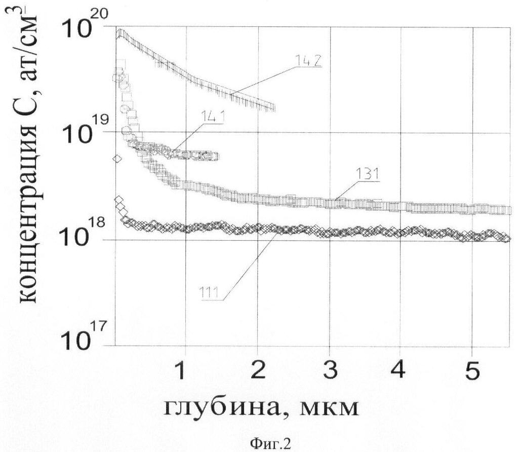 На фиг.2 представлен результат экспериментальной проверки распределений концентрации атомов водорода С, на глубинах от 0,005 до 5,00 микрон растворенного в пластинах, вырезанных из стенки трубы после 20 лет эксплуатации. Цифры соответствуют индексации (глубинам расположения поверхностей анализируемых элементов в стенке трубопровода)
