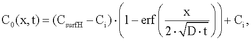 Глубина диффузии и распределение концентрации атомов водорода вдоль оси х очень медленно меняются со временем согласно уравнению нестационарной диффузии (второму закону Фика),