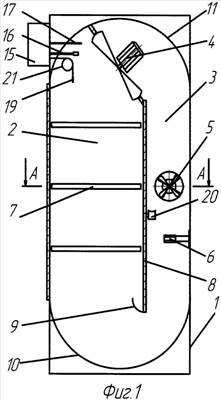 При использовании для сушки противней на протяжении всей сушки через каждые 5-15 минут, в зависимости от заданной посредствам блока управления программы, на 5-10 секунд включается электрический вибровозбудитель 24. Создаваемая вибрация распространяется на сетчатое дно 22 рамки 23, при этом благодаря пружинному подвесу 26 рамка 25 остается плотно закрепленной в стенках корпуса установки. Гранулы перги и куски сотов, находящиеся на вибрирующем дне, меняют свое месторасположение, что препятствует их слипанию и способствует более равномерному контакту с теплоносителем.