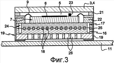 В этом варианте осуществления сборка (16, 17, 18) остается такой же, как та, которая описана в связи с фиг.2. В данном случае верхняя полость (5) тоже ограничена в верхней части корпуса, причем в упомянутой полости находится, в частности, микросхема (6, 7), а сама полость, напомним читателю, находится в условиях вакуума, приближающегося к 10-12 миллибар.