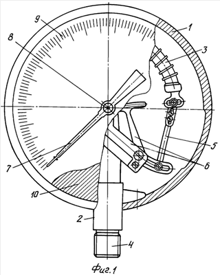 Известен манометр [6] – с профильной скобой, упирающийся в трубку Бурдона на корпусе, – состоящий из корпуса, шкалы, указательной стрелки и механизма ее перемещения с помощью трубчатой пружины, установленной на ниппельной опоре корпуса. При деформации трубчатой пружины сверх допустимой конец ее начнет упираться в неподвижный упор в виде скобы, в связи с чем перемещения конца трубчатой пружины прекратятся.