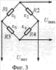 Очевидно, что при расположении окружных и радиальных тензорезисторов на периферии мембраны в области различных по величине относительных деформаций  и r относительные изменения сопротивлений окружных и радиальных тензорезисторов будут различны. При этом возникает нелинейность измерительной цепи датчика, которая зависит от коэффициента симметрии k и относительных изменений сопротивлений плеч измерительной цепи 1, 2, 3, 4 [5]. На фиг.3 показан измерительный мост с тензорезисторами R1, R2, R3 и R4, которым соответствуют относительные изменения сопротивлений 1, 2, 3, 4 при воздействии деформаций.