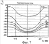 При измерении давления в условиях воздействия нестационарной температуры измеряемой среды, например, при воздействии на датчик, установленный на агрегате жидкостного реактивного двигателя, находящегося в нормальных климатических условиях, давления жидкого кислорода или водорода, на поверхности мембраны возникает нестационарное температурное поле. Нестационарное температурное поле возникает и при резком воздействии на датчик жидкого азота. На фиг.7 представлен график температурных полей на мембране в различные моменты времени с начала действия термоудара (воздействие жидкого азота) для случая, когда окружающей средой между мембраной и корпусом датчика является вакуум. Кривые построены для мембраны с диаметром d=5 мм, заделкой z=1,5 мм, толщиной h=0,31 мм с использованием алгоритма и программы [7].