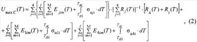 При источнике питания, отключенном от контактов 2 и 4 разъема датчика, элементы второй и четвертой цепи электрически не замкнуты, следовательно, они не будут влиять на выходной сигнал датчика. При источнике питания, подключенном к контактам 2 и 4 разъема датчика, влияние сигналов, вызванных термоэлектрическими явлениями, будет проявляться в изменении напряжения питания датчика. В реальных конструкциях датчиков термоЭДС, вызванные термоэлектрическими явлениями во второй и четвертой цепях, в 500-1000 раз меньше напряжения питания, поэтому их влиянием можно пренебречь. В связи с этим можно в соответствии с термоэлектрической моделью датчика с учетом выражения (2) и общих законов термоэлектрических явлений [4, 5] записать выражение для математической модели неинформативного преобразования термоЭДС в выходной сигнал датчика при воздействии нестационарных температур и виброускорений