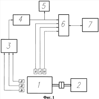 Поршневой двигатель 1 препарирован емкостными датчиками – D1, D2 Dn, для измерения толщины масляного слоя в наиболее представительных точках. Через многопозиционный переключатель 3 емкостные датчики D1, D2 Dn подключаются к входу электронного измерителя 4 толщины масляного слоя. Аналоговый сигнал с выхода измерителя 4 подается на устройство 6 связи с поршневым двигателем 1, где преобразуется в цифровой код и вводится в память персонального компьютера 7. Электронно-лучевой осциллограф 5 используется для настройки измерителя 4 толщины масляного слоя и визуального контроля выходного сигнала в процессе испытаний через компьютер 7.