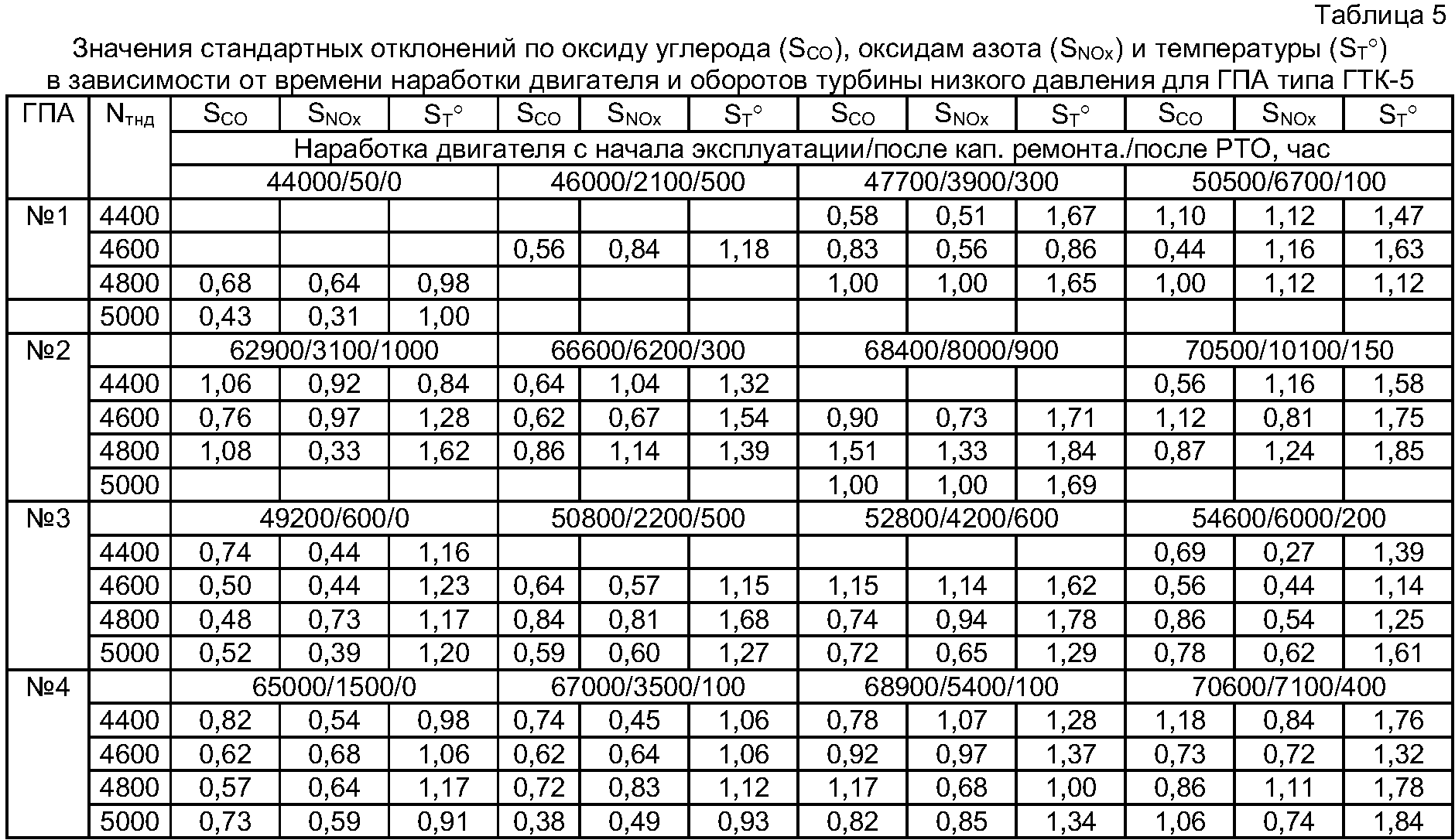 Анализ стандартных отклонений для ГПА Для ГПА Стандартные отклонения по температуре, большие 1,0, наблюдались при наработке двигателя 22800 час. При наработке 24900 час стандартные отклонения, большие 1,0, наблюдались по всем контролируемым параметрам. При наработке 26200 час произошел дальнейший рост стандартных отклонений по оксидам углерода, они на отдельных режимах достигли 1,3, по оксидам азота 1,5, по температуре 2,0. При наработке 26300 час были проведено РТО, и стандартные отклонения по всем параметрам стали ниже 1,0. На основании полученных данных по стабильности продуктов сгорания и температуры для ГПА типа Solar можно рекомендовать в качестве эталонных значений: все стандартные отклонения (S) меньше 1,0, состояние камеры сгорания и газовоздушного тракта хорошее, значения S по температуре больше 1,0 по оксиду углерода и оксидам азота близки к 1,0 – состояние хорошее, но следует увеличить частоту контроля вредных выбросов и применить другие методы диагностики. Значения S по температуре, по оксиду углерода и оксидам азота больше 1,0, но меньше 1,3 – состояние удовлетворительное, следует проводить эксплуатацию на отдельных режимах. Значения S по температуре близки к 2,0, по оксиду углерода и оксидам азота – 1,5 – состояние неудовлетворительное, следует проводить РТО. Пример 2. В табл. 5 представлены результаты расчетов стандартных отклонений по оксиду углерода (SCO), оксидам азота (SNOx) и температуры (ST° ) в зависимости от времени наработки стационарного двигателя с начала эксплуатации, после последнего капитального ремонта и с момента проведения РТО и числа оборотов турбины низкого давления (Nтнд) для ГПА типа ГТК-5 Для всех ГПА независимо от времени эксплуатации и времени, прошедшего с последнего капитального ремонта или с проведения РТО, характерным является постепенное возрастание стандартного отклонения по температуре выхлопных газов от 1 до 1,8. Стандартные отклонения по оксиду углерода и оксидам азота при эксплуатации до 3000 час после капитального ремонта имеют значения, меньшие единицы, после 3000 час возрастают свыше 1 и на отдельных режимах работы двигателя достигают 1,3 и значения выше этой величины не наблюдается. Также для двигателей этого типа при наработке свыше 6000 час наблюдается стабильность величины стандартного отклонения по температуре выхлопных газов, поэтому решение о времени проведения ТО или кап. ремонта по анализу стабильности продуктов сгорания и температуры затруднено. Тем не менее, проведение анализа и получение указанных значений будет свидетельствовать о нормальном состоянии ГПА. Пример 3 В табл. 6 представлены результаты расчетов стандартных отклонений по оксиду углерода (SCO), оксидам азота (SNox) и температуры (ST°) в зависимости от времени наработки и мощности авиационного двигателя марки ПС-90ГП-2 ГПА-16 «Урал»