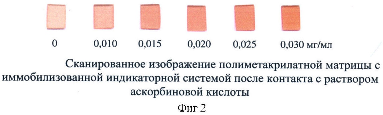 Для визуально-тестового определения АОА получены цветовые шкалы путем сканирования образцов, полученных при построении градуировочных зависимостей для АК. Визуальное тест-определение выполняли аналогично методике, описанной в примере 1, с тем отличием, что после контакта с аналитом поглощение полиметакрилатных матриц не измеряли, а проводили сравнение их окраски с цветовой шкалой (фиг.2) и полуколичественно определяли концентрацию восстановителей.