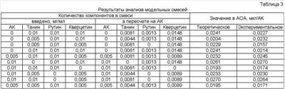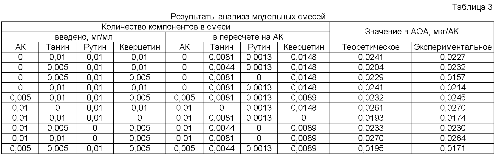 11. С.15-19). Для этого изучено влияние модельных смесей, в состав которых входили восстановители танин, рутин, кверцетин и АК в различных соотношениях, на индикаторную систему железо (III) – о-фенантролин, иммобилизованную в полиметакрилатную матрицу. Расчет теоретической величины интегральной АОА проводили по уравнениям количественного соответствия, характеризующим антиоксидантную способность исследуемого восстановителя по отношению к аскорбиновой кислоте как вещества-стандарта (таблица 2). Экспериментальные значения АОА рассчитывали по усредненному уравнению регрессии для зависимости A510 от количества аскорбиновой кислоты. Из результатов, представленных в таблице 3, видно, что экспериментально полученные величины АОА удовлетворительно согласуются с теоретически рассчитанными. Полученные данные показывают, что определяемая величина АОА является результатом совместного действия всех присутствующих в модельной смеси восстановителей. Таким образом, определяемый показатель является интегральным, и оптическая мембрана на основе полиметакрилатной матрицы с иммобилизованной системой железо (III) – о-фенантролин может быть использована при разработке способа оценки интегральной АОА.