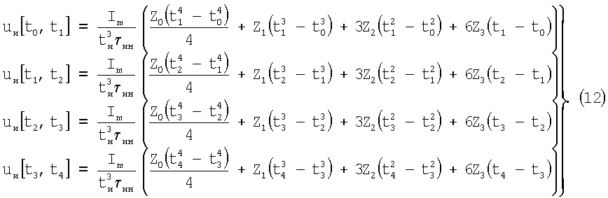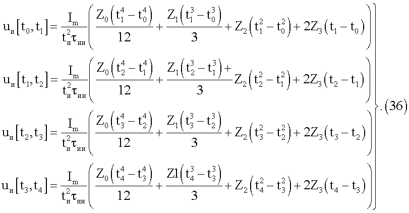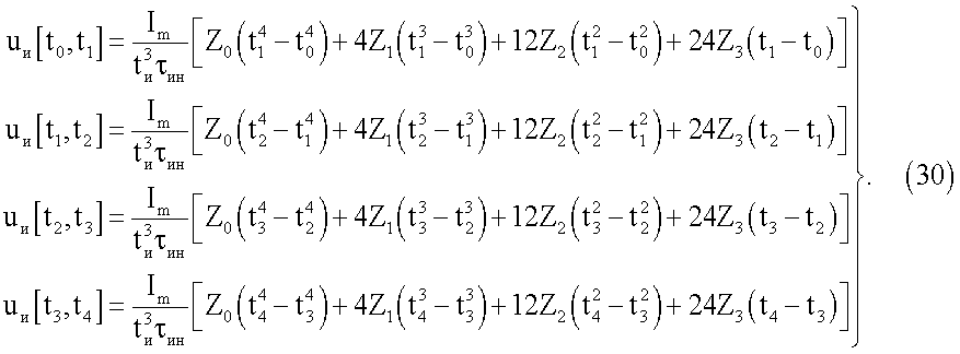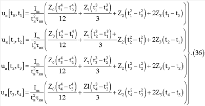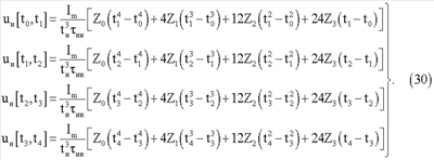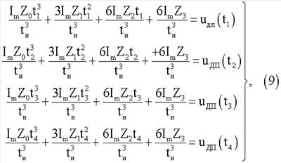 Для определения четырех неизвестных величин достаточно произвести измерения напряжения в четырех точках установившегося процесса в моменты времени t = t1, t2, t3, t4 и решить относительно Z0, Z1, Z2, Z3 систему четырех уравнений: