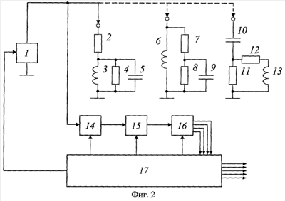 Измеритель параметров содержит генератор 1, формирующий последовательность импульсов тока, изменяющегося по закону n-й степени времени. Генератор импульсов имеет вход синхронизации, его общая шина заземлена. Выход генератора 1 соединен с первым полюсом двухполюсника объекта измерения. Второй полюс двухполюсника заземлен. На чертеже в качестве примеров приведены три варианта четырехэлементных двухполюсников с разнородными реактивными элементами: R-L-R-C типа с конечным сопротивлением для постоянного тока, L-R-R-С типа с нулевым сопротивлением для постоянного тока и C-R-R-L типа с бесконечным сопротивлением для постоянного тока. В обозначениях двухполюсников каждого типа символы элементов указаны в том порядке, в каком вычисляются их параметры. Первый двухполюсник (R-L-R-C) объекта измерения состоит из первого резистора 2, последовательно с которым включены параллельно соединенные катушка 3 индуктивности, второй резистор 4 и конденсатор 5. Второй двухполюсник (L-R-R-C) объекта измерения содержит катушку 6 индуктивности, параллельно которой включены последовательно соединенные первый резистор 7 и параллельно включенные второй резистор 8 и конденсатор 9. Третий двухполюсник (C-R-R-L) объекта измерения содержит последовательно соединенные конденсатор 10 и первый резистор 11, параллельно которому подключены последовательно соединенные второй резистор 12 и катушка 13 индуктивности.