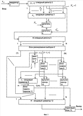 Устройство работает следующим образом. На квадратор 1 поступают отсчеты огибающей xi,n с выхода приемного устройства РЛС. С выхода квадратора 1 отсчеты поступают на (Nw+1) – отводный регистр 2, с центрального отвода которого в каждом из периодов пачки снимаются и подаются на первый вход второго делителя 4 отсчеты в проверяемом элементе дальности. Отсчеты с отводов регистра 2 подаются на Nw – входовый сумматор 3 и далее на первый делитель 4, в результате чего определяются и подаются на второй вход второго делителя 4 оценки мощности помех в каждом периоде повторения импульсов. Квадраты огибающей принятых сигналов нормируются к оценкам мощности помех во втором делителе 4 и записываются в N – отводный регистр 5, N выходов которого соединены с соответствующими входами блока ранжирования выборки 6. С выходов блока 6 отсчеты снимаются в порядке возрастания, так что первому выходу соответствует минимальный отсчет , а выходу N – максимальный отсчет Отсчеты , , с выходов 1, ,N-Ns блока 6 без изменений подаются на N-входовый сумматор 13, так как в них не могут содержаться отсчеты НС. Отсчеты с выходов N-Ns+1, ,N блока ранжирования выборки 6 подвергаются дополнительной обработке, которая заключается в их сравнении в блоках сравнения 8 с умноженным на коэффициент в блоке умножения 7 сигналом c выхода N-Ns блока ранжирования выборки 6. На выходах блоков сравнения 8 в случае непревышения сигналов с выхода блока ранжирования выборки 6 над сигналом с выхода блока умножения 7 появляются единичные сигналы, которые, поступая на управляющие входы мультиплексоров 10, разрешают прохождение сигналов с выходов блока ранжирования выборки 6 на входы N-входового сумматора 12. При наличии в выборке отсчетов НС большой амплитуды прохождение сигналов с выходов блока ранжирования выборки 6 на входы N-входового сумматора 12 запрещается, данные сигналы исключаются из дальнейшей обработки. Сумма нормированных сигналов, прошедших обработку, с выхода блока N-входового сумматора 12 подается на первый вход порогового блока 13, выход которого является выходом устройства. На второй вход порогового блока 13 с выхода блока памяти порогов 11 подается величина порога обнаружения, которая соответствует числу сигналов N-m, которые остались в обработке. Величина N-m определяется суммированием в блоке Ns-входового сумматора 9 одноразрядных сигналов с выходов блоков сравнения 8 и подается на вход блока памяти порогов 11.