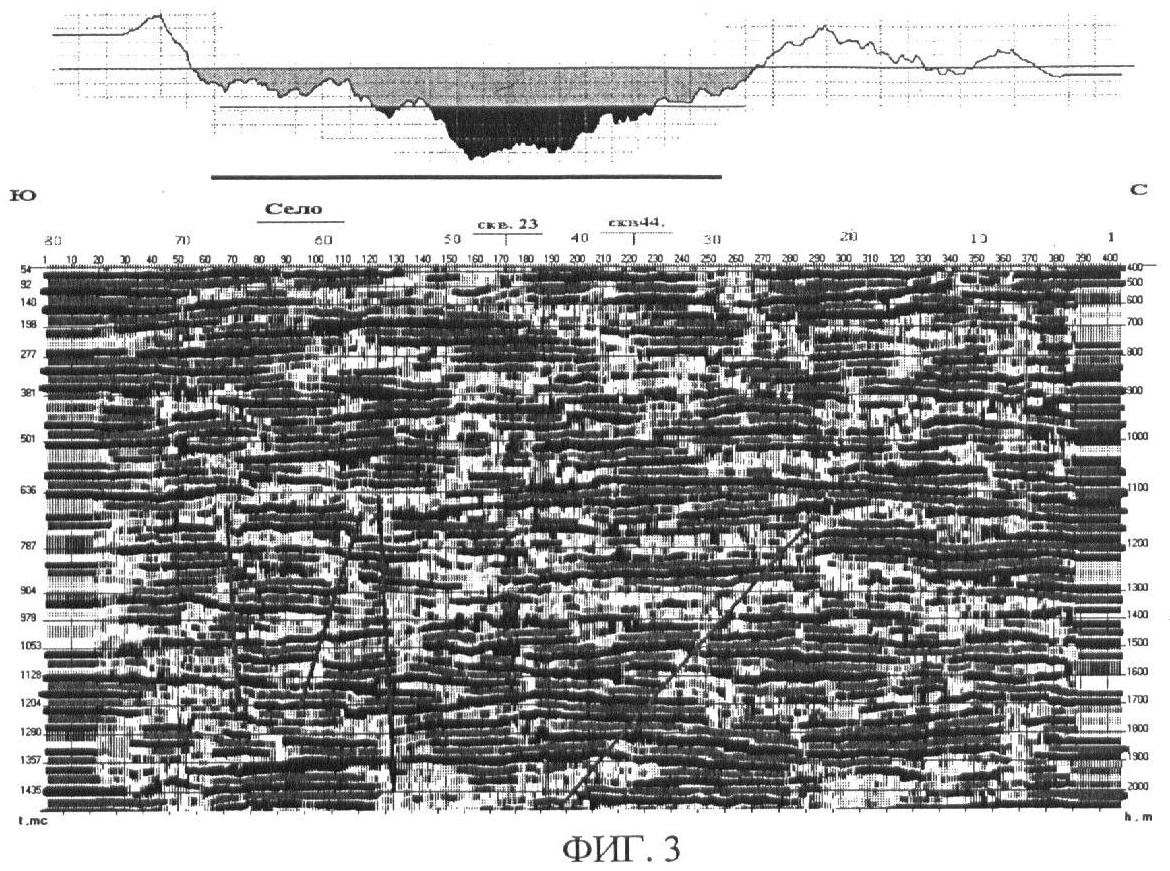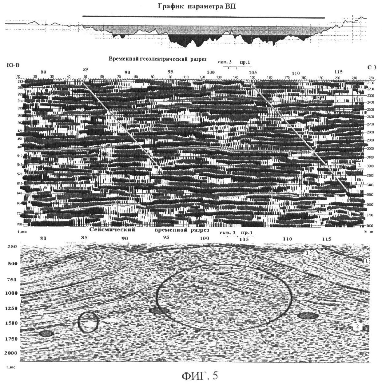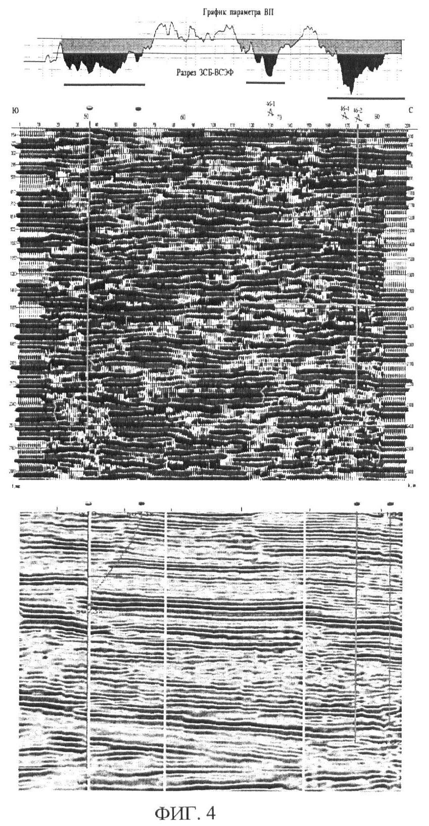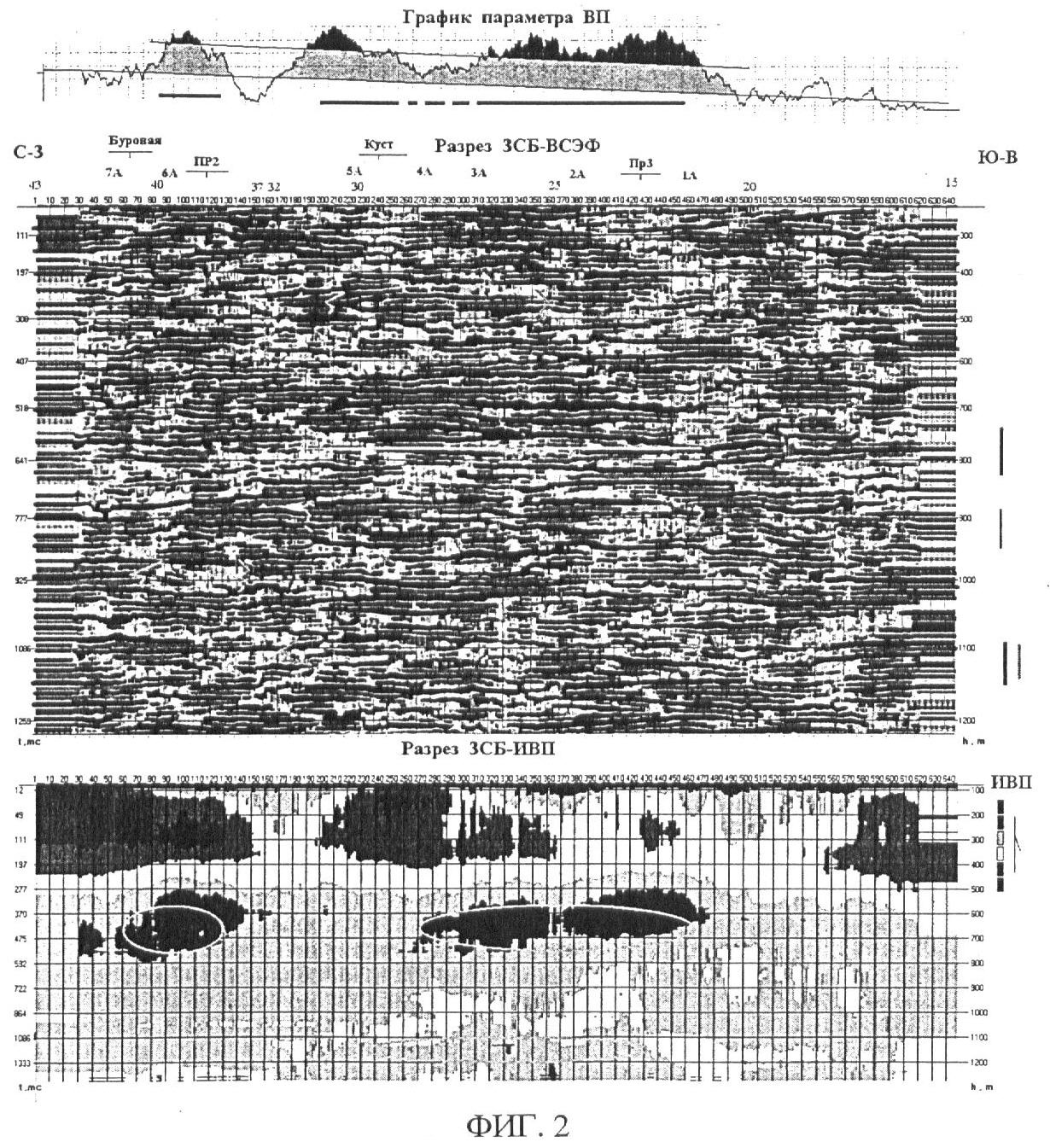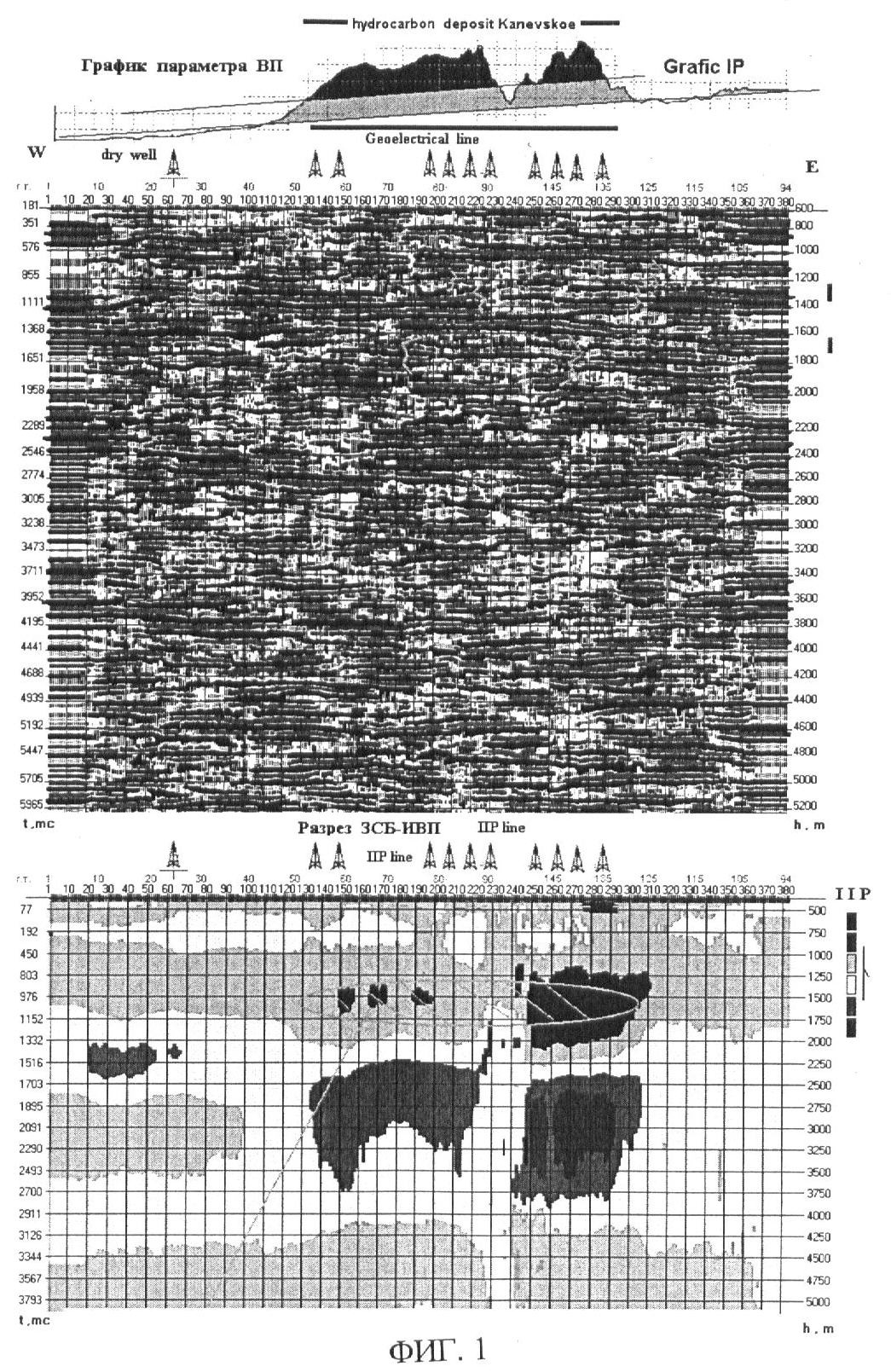 Электроразведочные работы выполняли над известными по сейсмическим данным углеводородными структурами. ЭМП возбуждали токовым импульсом прямоугольной формы длительностью 1-3. Измерения процесса становления ЭМП проводили поканально дипольно-симметричной многоканальной многоэлектродной установкой с количеством электродов в 6-8 раз больше количества каналов. Для реализации метода ЗСБ-ИВП регистрировали напряженность ЭМП ИВП в соответствии с выражением (1), а осцилляции ИВП для построения геоэлектрического разреза выделяли из измеренного сигнала полного ЭМП по методике, описанной в [1]. Наличие в исследуемом районе нефтегазовых месторождений и определение их контуров и глубины осуществляли (аналогично [1]) посредством сравнения корреляции результатов анализа данных исследуемого района с характеристиками известных эталонных (или теоретически рассчитываемых значений gИВП,теор) углеводородных залежей и/или пустых ловушек.