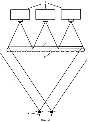 На фиг.1(a) (вид сверху) и 1(б) (вид сбоку) приведен вариант схемы устройства с шестью матричными панелями и проекционными объективами. Устройство состоит из просветного экрана – 1, цилиндрического линзового растра – 2, шести проекторов с разрешением 1024×768 точек на дюйм, расположенных в виде матрицы 3×2 по горизонтали и вертикали соответственно – 3. Зритель – 4 наблюдает на экране стереоскопическое изображение.