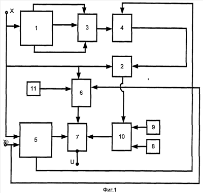 Блок управления 6 в данном примере технической реализации устройства представляет собой типовую схему интегратора, содержащего усилитель 24, пневмоемкость 27, переменный дроссель 29 и усилитель мощности 25. Кроме того, в блок 6 введен дроссельный сумматор 26 и усилитель мощности 28. Входами блока 6 являются сигнал задания x0, сигнал переменной х и выходной сигнал третьего задатчика 11, который суммируется с выходным сигналом интегратора в сумматоре 26. В результате на выходе блока 6 формируется сигнал, величина которого определяется выражением (3).