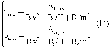 Формульные зависимости (14) реализуются в схеме предлагаемого устройства. Величины v, Н, m измеряются датчиками 1 3, величина v2 вычисляется в первом блоке умножения 11, слагаемые знаменателя выражений (14) вычисляются во втором блоке умножения 14 и в первом 12 и втором 13 блоках деления, на вторые входы которых из задатчика опорных сигналов 10 подаются константы В1, В2, В3. Знаменатель вычисляется в сумматоре 15, обратная величина его – в блоке формирования обратной величины сигнала 16, в блоке масштабирования 17 вычисляются величины iв, iн, iэ, в, н, э путем умножения величины, обратной знаменателю, на постоянные масштабные величины А1 в,н,э, А2 в,н,э.