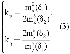 где – аэродинамические коэффициенты эффективности первого и второго рулей (при схеме расположения рулей по фиг.1, 2) относительно осей крена и курса летательного аппарата. Формулы (3) получены в предположении равенства коэффициентов эффективности для второго и третьего рулей.