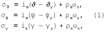 где iв, iн, iэ, в, н, э – передаточные числа контура управления и стабилизации по позиционным и демпфирующим сигналам, определяемые контуром адаптации системы; x, y, z – угловые скорости вращения ЛА, являющиеся выходными сигналами блока демпфирующих гироскопов 4.