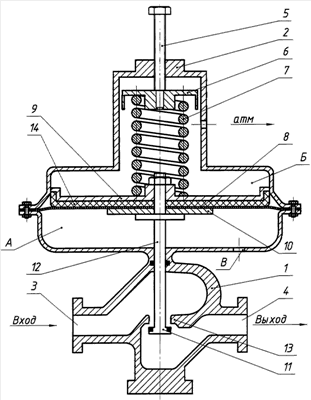 Во входную полость 3 регулятора давления газа подается газ и затем, после снижения давления на регулирующем устройстве: клапан 11, шток 12, седло 13, газ поступает в выходную полость 4 и далее к потребителю.