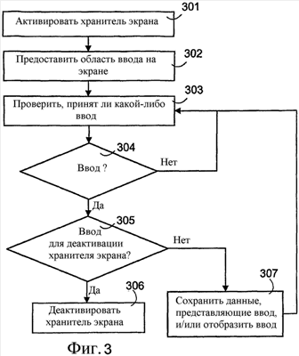 Устройство выполнено с возможностью сохранять данные, представляющие ввод, и/или чтобы отображать ввод на этапе 307, если ввод не предназначен для деактивации хранителя экрана. Следует отметить, что вместо или в добавление к этапу отображения ввода, с вводом могут быть выполнены другие действия, как будет проиллюстрировано ниже. После этапа 307 процесс может вернуться к этапу 303 для обнаружения новых вводов.