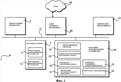 Как вкратце упомянуто выше, ряд программных модулей и файлов с данными могут храниться в массовом запоминающем устройстве 14 и ОЗУ 9 компьютера 2, включая операционную систему 16, подходящую для управления работой сетевого персонального компьютера, такую как операционная система WINDOWS XP корпорации Microsoft Corporation, г. Редмонд, шт. Вашингтон. Массовое запоминающее устройство 14 и ОЗУ 9 также могут хранить один или несколько программных модулей. В частности, массовое запоминающее устройство 14 и ОЗУ 9 могут хранить клиентское приложение 24 электронной почты. Клиентское приложение 24 электронной почты служит для отправления и приема сообщений 26 электронной почты по сети 18. Отправляемые и принимаемые сообщения электронной почты также могут включать в себя вложения 28. Вложения могут содержать любой тип файла и обычно включают в себя фотоснимки, документы по обработке текста, сжатые файлы и другие типы файлов.
